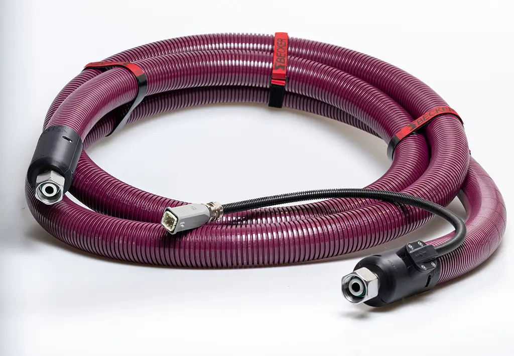 The hose system features a high-pressure PTFE inner core reinforced with triple-layer steel braiding, combined with an abrasion-resistant insulated heating element for uniform heat distribution. A dual-layer insulation system and robust corrugated outer protection ensure thermal stability and mechanical durability.